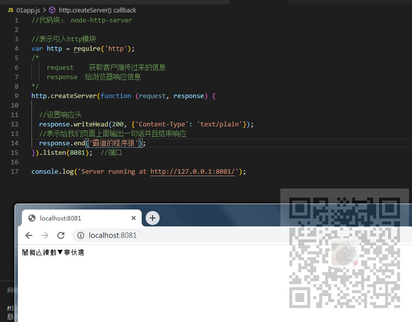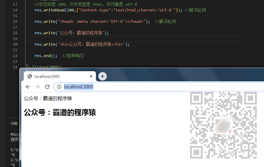 res.writeHead(200,{"Content-type":"text/html;charset='utf-8'"}); //解决乱码res.write(" "); //解决乱码 const http =require('http');/* req 获取客户端传过来的信息 res 给浏览器响应信息*/http.createServer((req,res)= >{ console.log(req.url); //获取url //设置响应头 //状态码是 200,文件类型是 html,字符集是 utf-8 res.writeHead(200,{"Content-type":"text/html;charset='utf-8'"}); //解决乱码 res.write(" "); //解决乱码 res.write('公众号:霸道的程序猿'); res.write('公众号:霸道的程序猿
